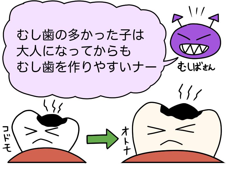 (幼少期のむし歯リスクは、大人になっても引き継がれるのです)